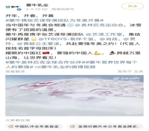 此外在開幕式前,蒙牛正式發(fā)布了冬奧會主題片,明星陣容龐大。導(dǎo)演是張藝謀,易烊千璽、肖戰(zhàn)、賈玲、谷愛凌等蒙牛代言人悉數(shù)出現(xiàn)在鏡頭里。這是一個標(biāo)準(zhǔn)的品牌大片,冰雪和中國紅色窗花相遇,各位代言人用滑雪、滑冰的姿態(tài)出現(xiàn)在鏡頭里,穿插著意大利的城市景觀和冬奧賽事鏡頭??垲}、陣容強(qiáng)大、有視覺美感。