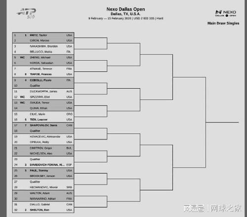 我們?cè)賮?lái)關(guān)注其它消息。北京時(shí)間昨天,本周的兩站ATP巡回賽相繼公布了正賽簽表。ATP500美國(guó)達(dá)拉斯公開賽,兩位本土名將弗里茨、謝爾頓位列前兩號(hào)種子,衛(wèi)冕冠軍是加拿大名將沙波瓦洛夫。