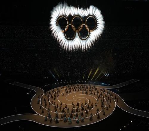 開幕式現(xiàn)場的奧運五環(huán)。新華社記者 程敏 攝