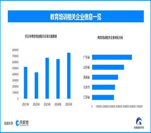 天眼查專業(yè)版數(shù)據(jù)顯示,截至目前我國現(xiàn)存在業(yè)、存續(xù)狀態(tài)的教育培訓(xùn)相關(guān)企業(yè)超533.7萬家。其中,2025年新增注冊相關(guān)企業(yè)約75.8萬余家,從企業(yè)注冊數(shù)量趨勢來看,近五年間,教育培訓(xùn)相關(guān)企業(yè)的注冊數(shù)量大體呈現(xiàn)出增長態(tài)勢,并在2025年達(dá)到頂峰。