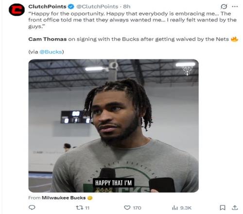托馬斯在簽約雄鹿后接受采訪,他說(shuō)道:很高興能有這個(gè)機(jī)會(huì)加盟雄鹿,也很高興大家接納了我,球隊(duì)管理層告訴我,他們一直都希望我能加入,我能感受到隊(duì)友們的認(rèn)可。