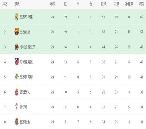 在積分榜上,皇馬以60分排名榜首?;蜀R的戰(zhàn)績是19勝3平2負(fù)。巴薩則以58分屈居第2名。不過,巴薩比皇馬少踢1輪,接下來有機(jī)會(huì)重登榜首。比利亞雷亞爾45分排名第3。馬競慘敗之后,依然是45分,但凈勝球比比利亞雷亞爾少,跌到了第4名?;始邑惖偎冠A球后,總積分是41分,繼續(xù)縮小與身前球隊(duì)的差距,排名第5,距離歐冠區(qū)越來越近。西班牙人拿到35分,排名第6。